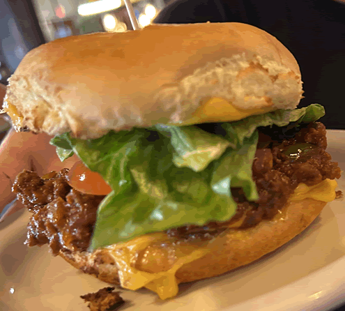 Lunch Lady Certified homemade Sloppy Joes with American cheese, lettuce tomato and pickles, served on a buttery brioche bun