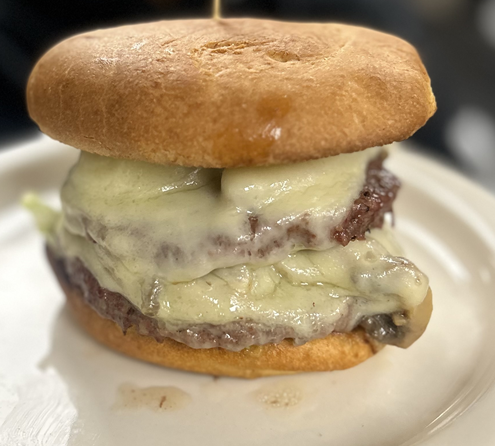 Two Black Angus Burgers, creamy swiss, mushrooms, sweet onions, lettuce and tomato, served on a buttery brioche bun