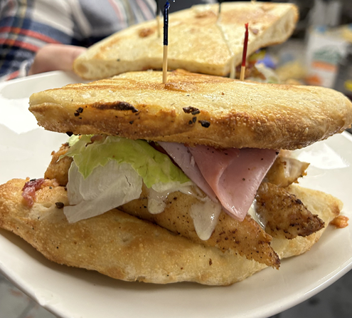 Grilled or crispy chicken on a Rooster’s Half Baked, smoked bacon, sugar cured ham, mozzarella and provolone cheese, lettuce, tomato and pickles