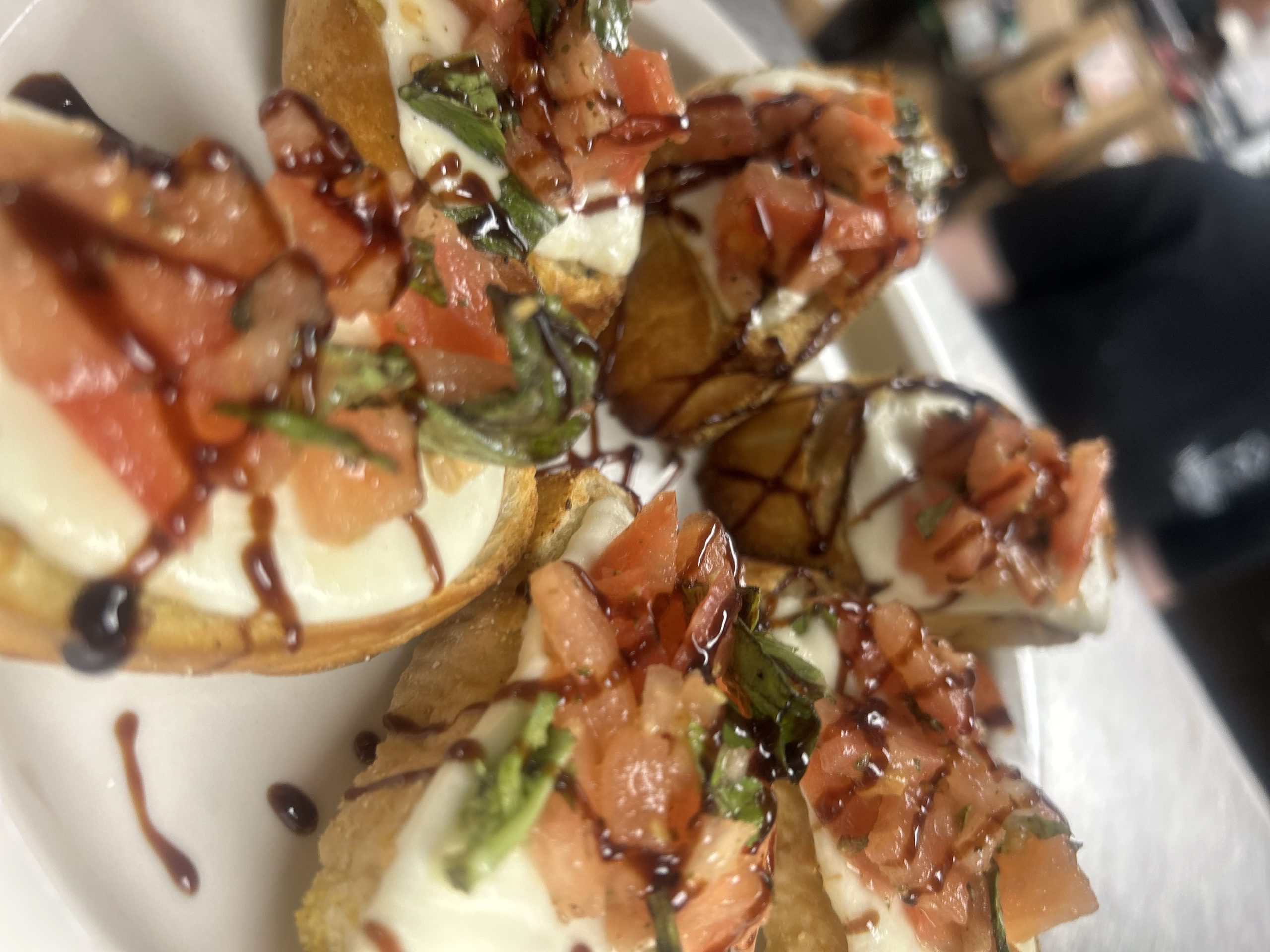 Sliced Cherry Tomatoes, Fresh Basil and Brochette Seasoning Tossed in Balsamic Vinegar and Olive Oil, Topped with Feta Cheese and served on Garlic Toasted Drizzled with Balsamic Glaze