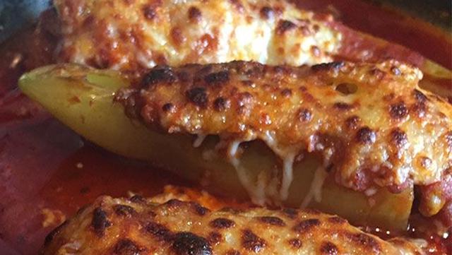 Hot Sausage and Ricotta Stuffed Banana Peppers Served with Roosters’s Basil marinara sauce