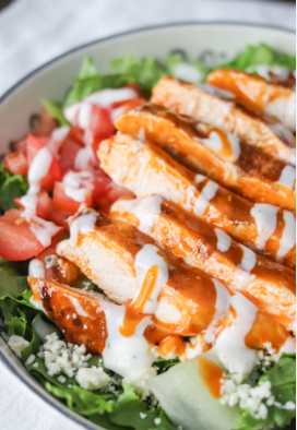 Our House Salad w/ Grilled or Fried Chicken in a Tangy Mild Sauce smoked bacon, fries and cheddar cheese