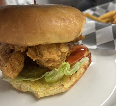 Rooster’s signature crispy chicken tenders stacked high on a buttery brioche bun with lettuce, tomato, pickles and “Flew the Coop” sauce
